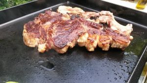 Vous avez terminé avec l’entrée ? Relancez votre plaque pour préparer le plat principal. Déposez-y votre côte de bœuf. Faites cuire 7 minutes et retournez. Faites mijoter dans une poêle de l’ail, des oignons émincés et des tomates en dés. Il ne vous reste plus qu’à verser la sauce sur votre viande et de la servir.