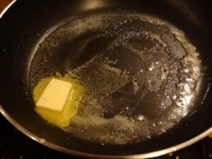 Faites ensuite chauffer de la margarine ou du beurre. Sinon, il est aussi possible d’utiliser de l’huile. Veillez à ce que toute la surface de la poêle soit bien graissée. Pour savoir que la matière grasse est suffisamment chaude, vous pouvez asperger quelques gouttes d’eau par-dessus. La température est bonne quand vous verrez des gouttelettes qui grésillent et qui s’évaporent par la suite.