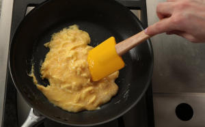 Vous pouvez maintenant verser les œufs dans la poêle tout en remuant à l’aide d’une spatule. Veillez à ce que toutes les parties humides du mélange soient bien exposées à la chaleur. De cette manière, aucune croûte brune ne se formera sur le fond de la poêle. Lorsque les œufs sont presque cuits, ôtez-les du feu et laissez la chaleur de la poêle finir la cuisson.