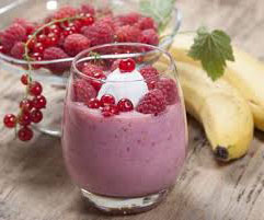Pour mettre un peu de couleur dans votre verre, faites un smoothie de banane et de framboise. Il suffit, selon la règle précitée, de mettre une poignée de framboises surgelées et une banane fraîche dans votre blender. Ajoutez un yaourt de soja, un pot de lait d’amande, du sirop d’agave et quelques framboises en décoration.